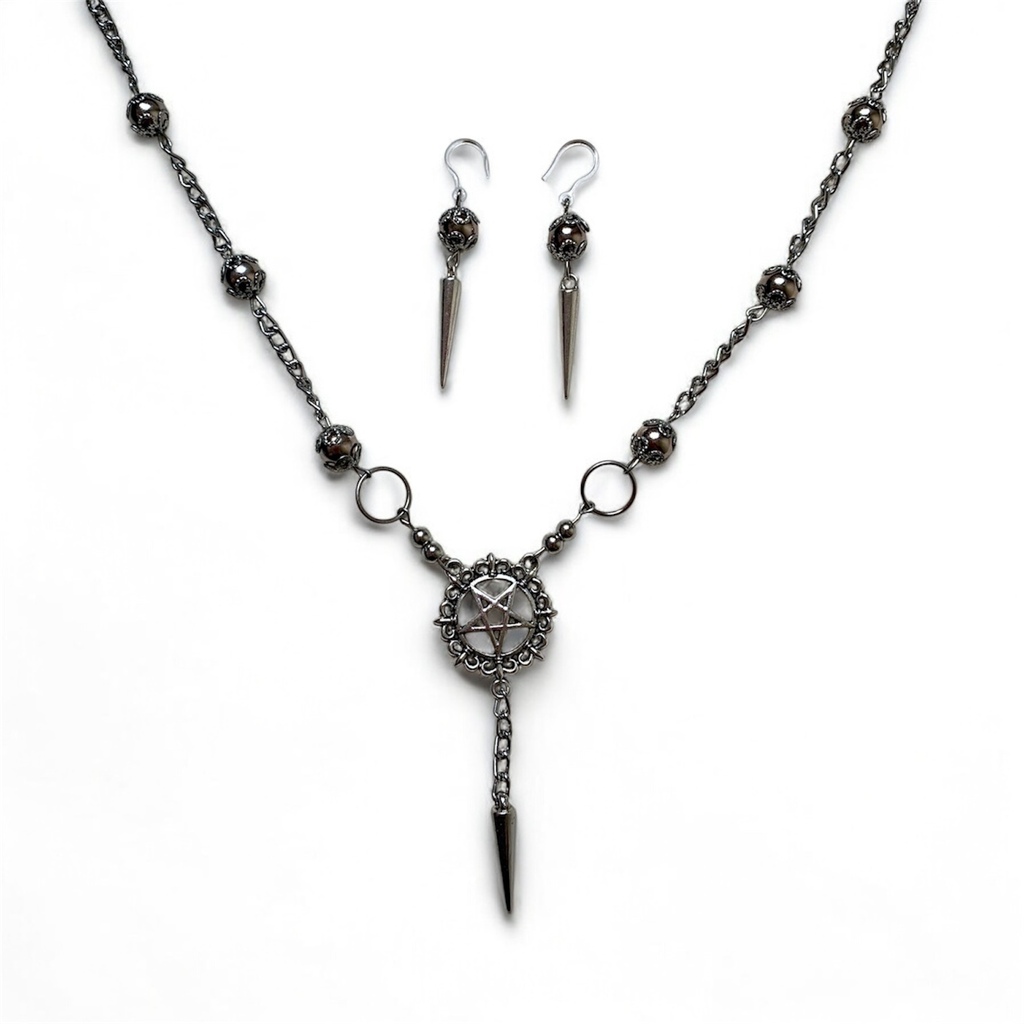 O destaque do colar é o pingente de pentagrama central, cercado por ornamentos elaborados, que traz um ar de sofisticação e simbolismo. O detalhe em forma de ponta (spike) adiciona um toque ousado e gótico ao design, perfeito para quem não tem medo de se destacar.