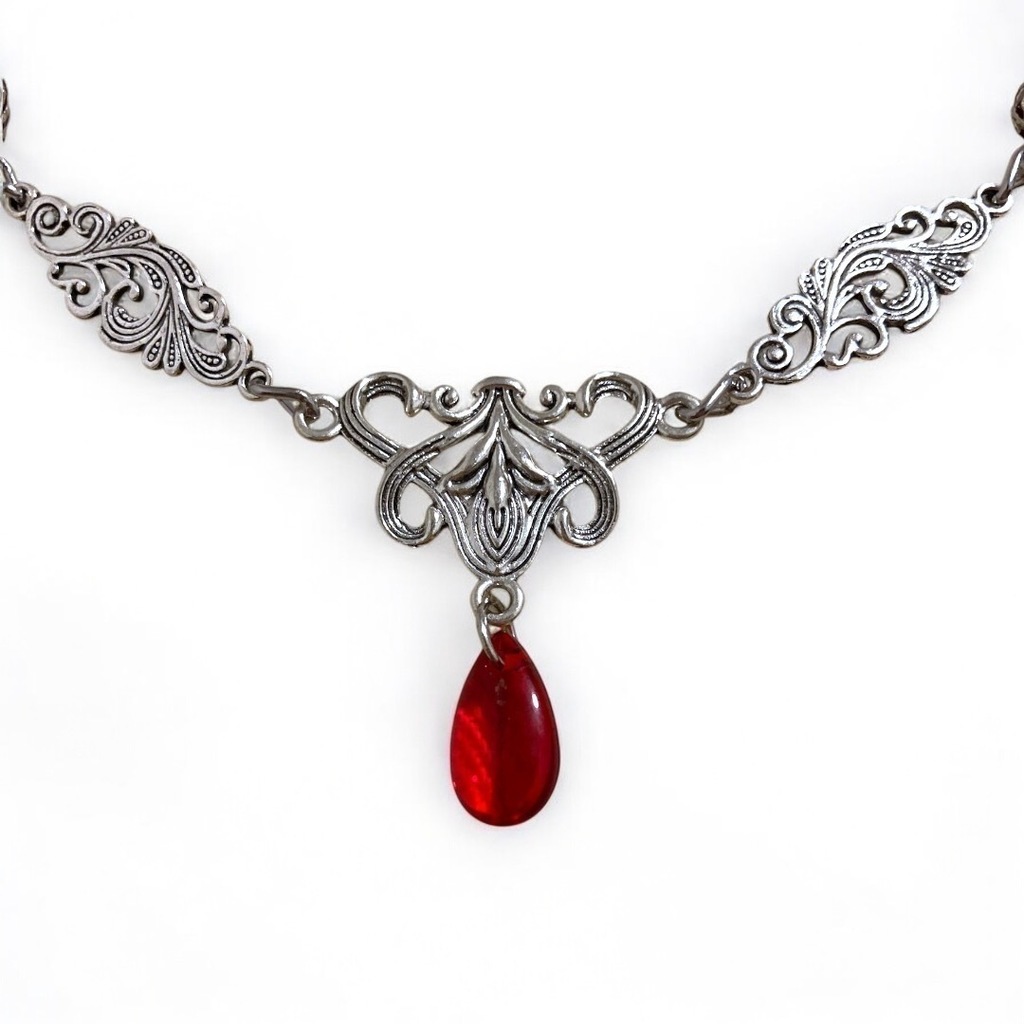 Acompanhe o colar com os brincos em formato de gotas, confeccionados com as mesmas contas vermelhas. Este conjunto é perfeito para quem deseja adicionar um charme clássico a produções modernas ou complementar looks góticos.
