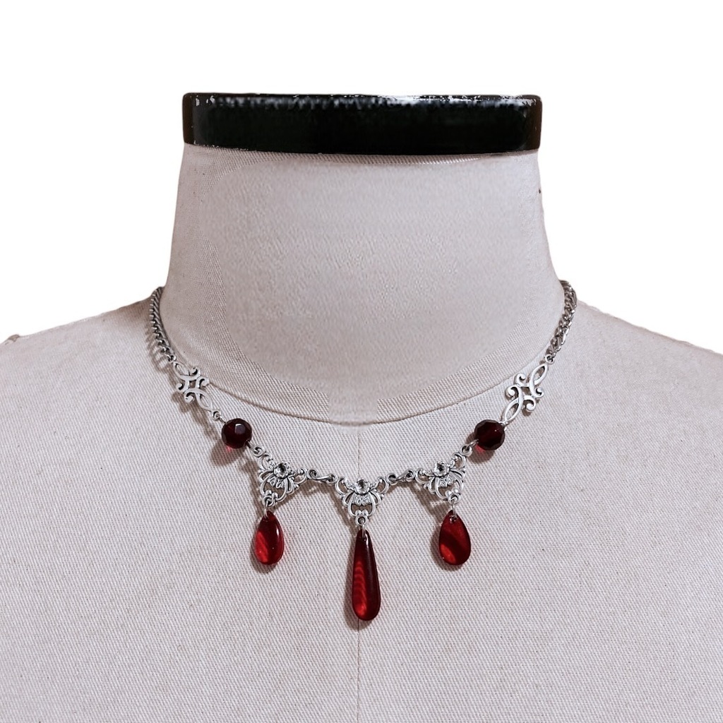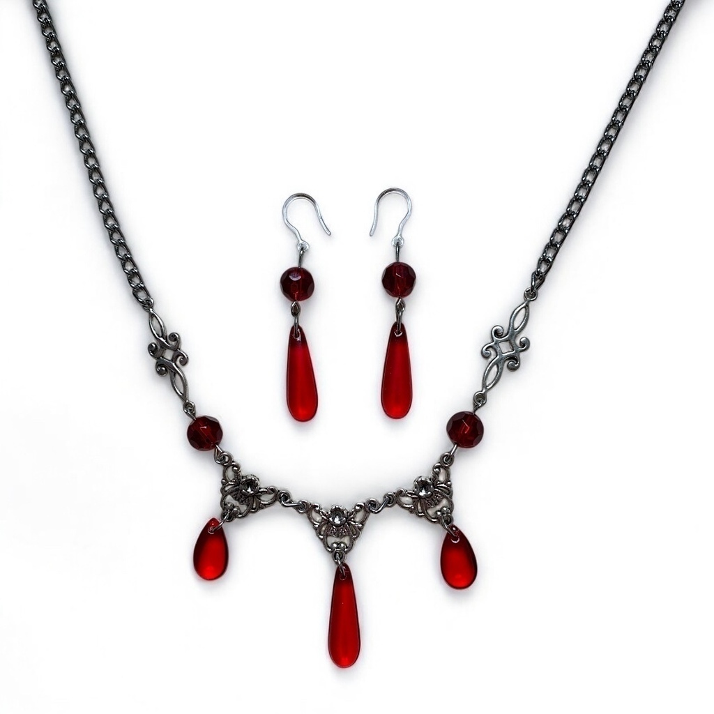 Descubra o Conjunto Vamp Raven, uma verdadeira obra-prima que combina o charme do aço inoxidável com o brilho intenso das contas vermelhas em formato de gotas.
